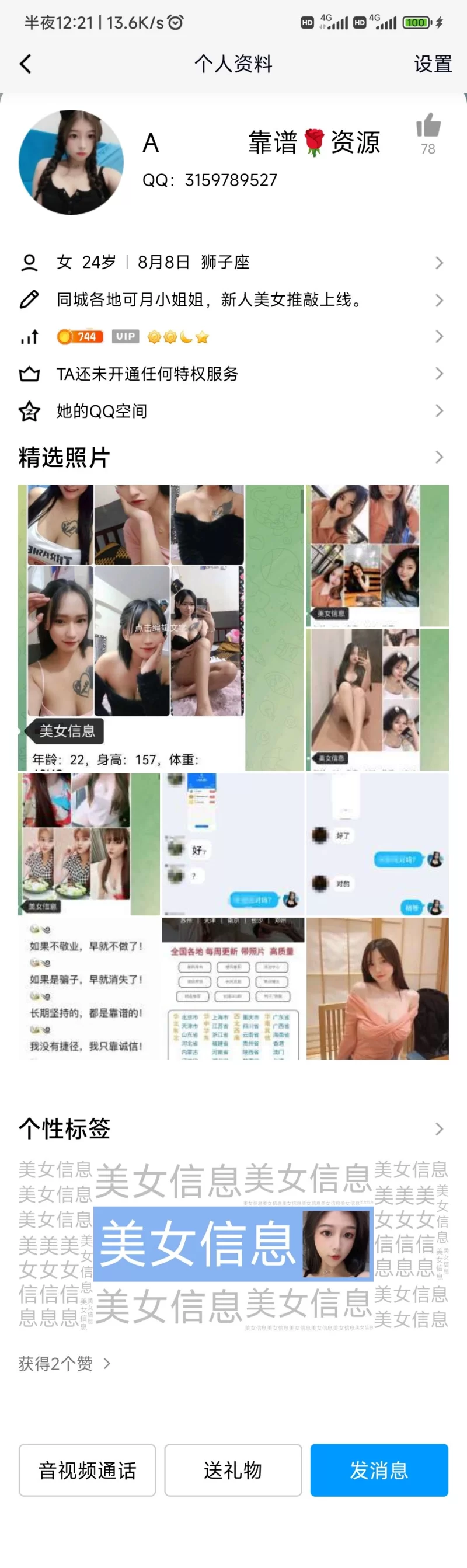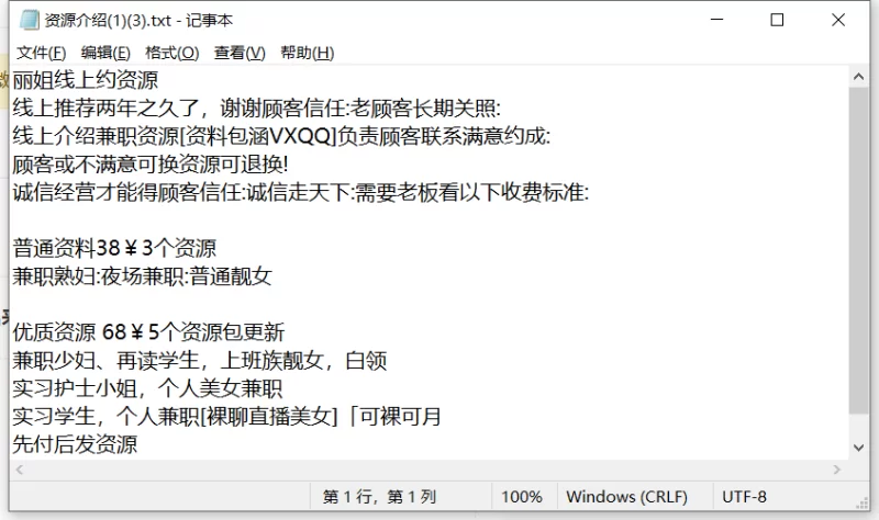 信息分类:骗子曝光 地区:福建省-厦门 信息来源:QQ群 年龄:无 颜值身材:无 服务项目:介绍妹子资源(应该是买的小号) 价格:38普通资源、68优质资源 环境设备:无 详细地址: (管理提示:经用户举报,此信息有诈骗行为,请勿被骗!) 联系方式(QQ号): (管理提示:经用户举报,此信息有诈骗行为,请勿被骗!) 详细介绍: 没有服务,给的妹子qq号全是小号,以诚信骗人,甚至会以老哥稳界面诈骗 骗子曝光
